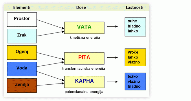 Po Ajurvedi osnovne procese delovanja v naravi zagotavljajo tri doše (energije) Vata, Pita in Kapha, ki so v različnih razmerjih prisotne povsod.